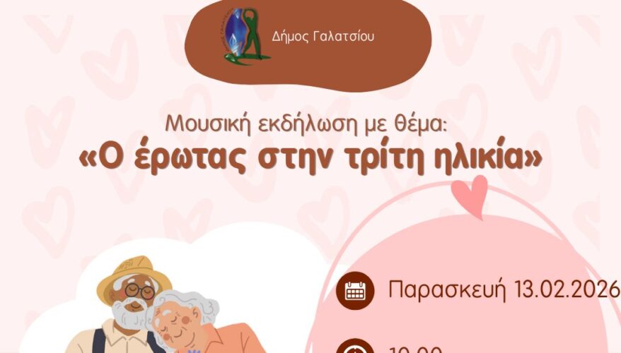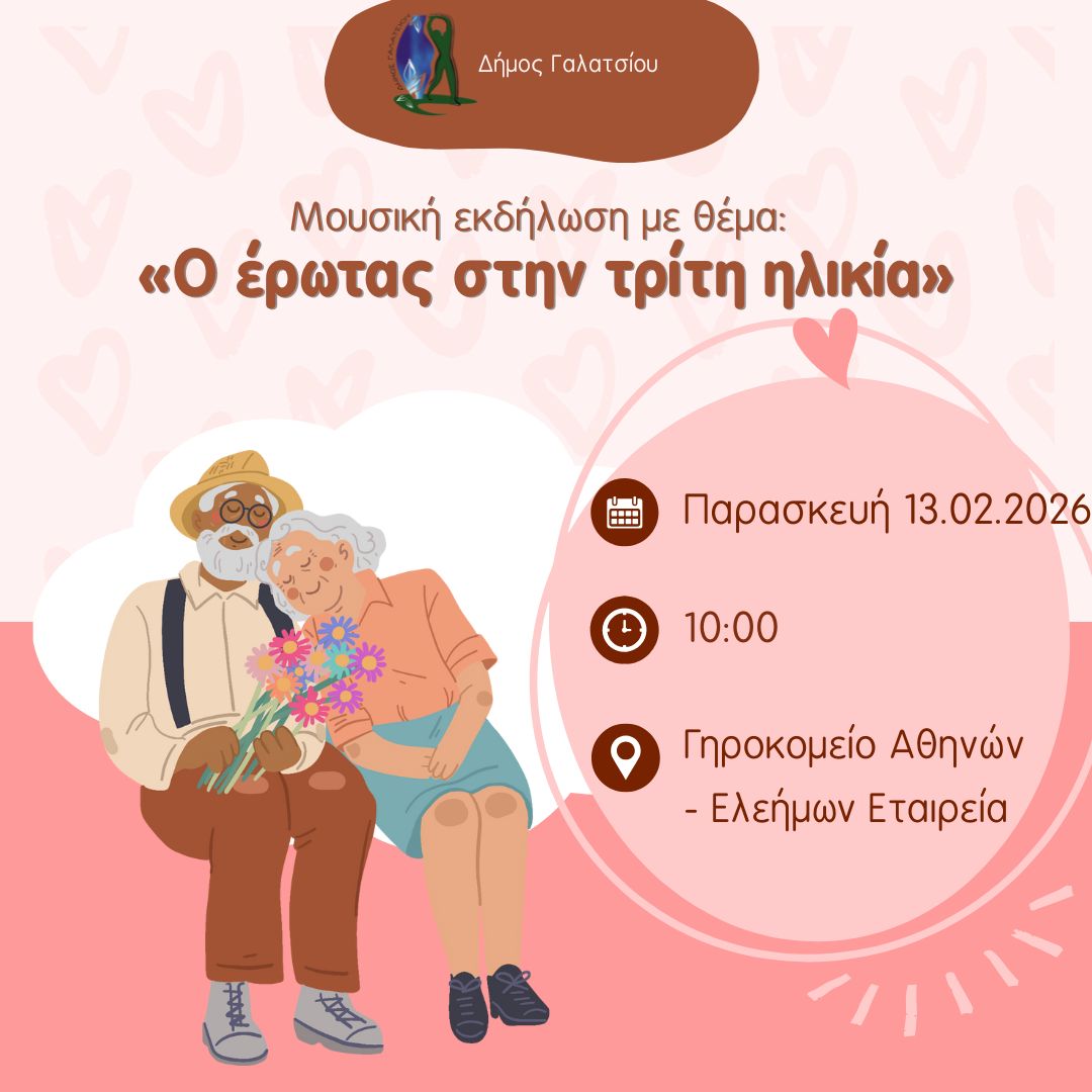 Την Παρασκευή 13 Φεβρουαρίου 2026 και ώρα 10:00, θα πραγματοποιηθεί μουσική εκδήλωση με θέμα: «Ο έρωτας στην τρίτη ηλικία», με αφορμή την Ημέρα του Αγίου Βαλεντίνου στις 14 Φεβρουαρίου, στο Γηροκομείο Αθηνών – Ελεήμων Εταιρεία, το μεγαλύτερο ίδρυμα φιλοξενίας ηλικιωμένων της χώρας.