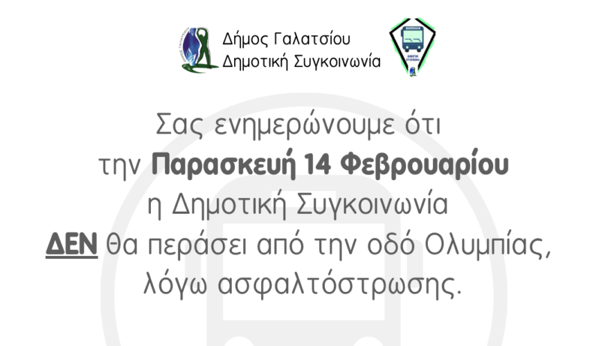Σε συνέχεια της χθεσινής ανακοίνωσης, σας ενημερώνουμε εκ νέου, ότι την Παρασκευή 14 Φεβρουαρίου, η Δημοτική Συγκοινωνία ΔΕΝ θα περάσει από την οδό Ολυμπίας, λόγω ασφαλτόστρωσης.