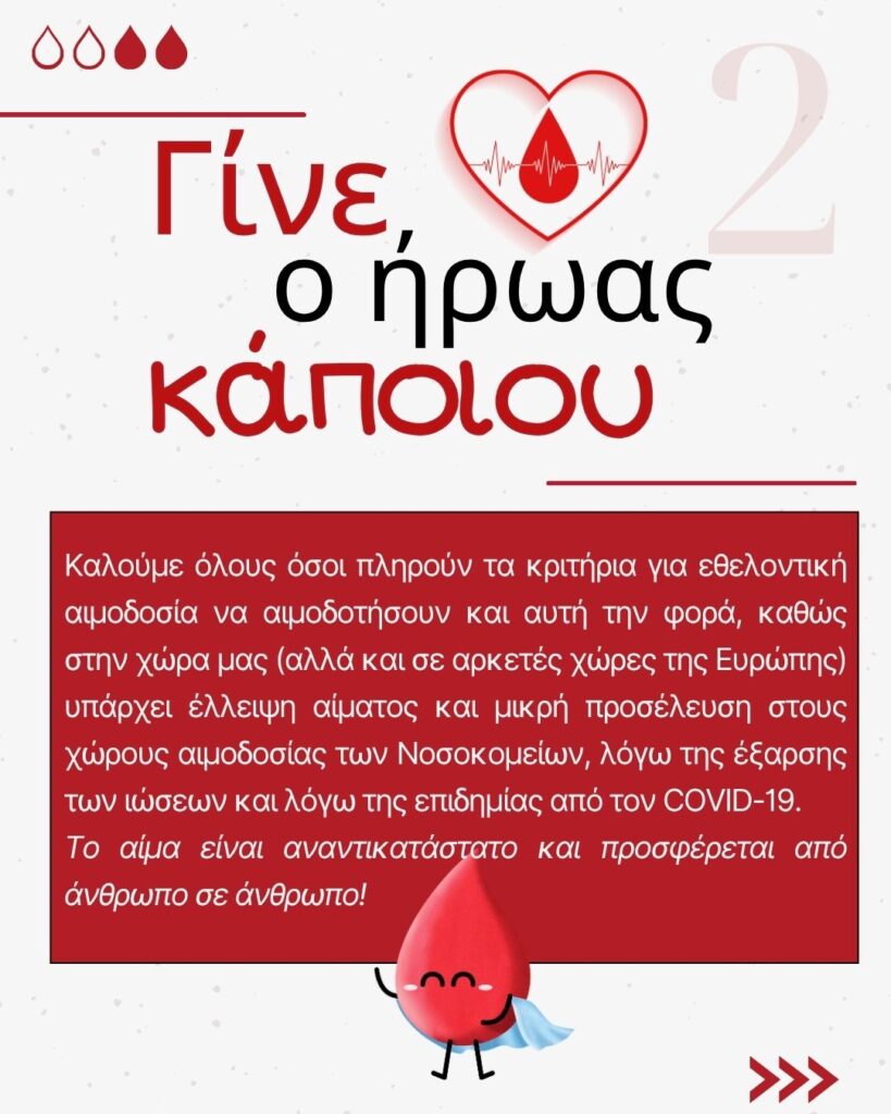 Καλούμε όλους όσοι πληρούν τα κριτήρια για εθελοντική αιμοδοσία να αιμοδοτήσουν και αυτή την φορά, καθώς στην χώρα μας (αλλά και σε αρκετές χώρες της Ευρώπης) υπάρχει έλλειψη αίματος.