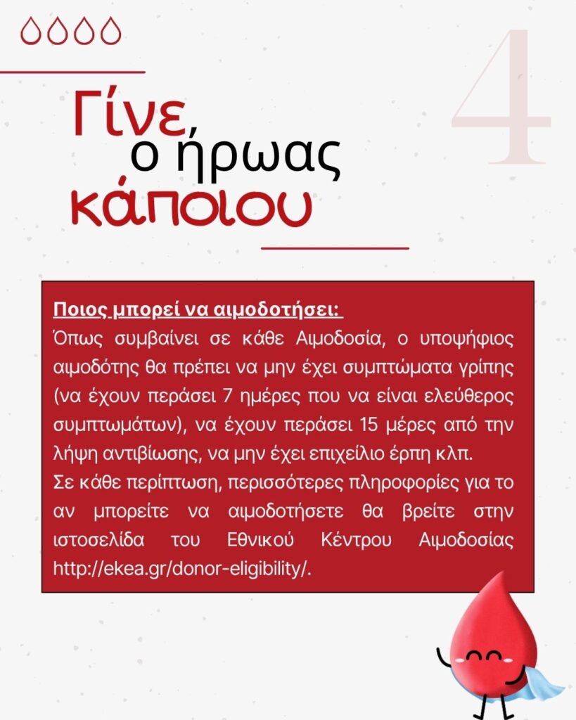Ποιος μπορεί να αιμοδοτήσει: Όπως συμβαίνει σε κάθε Αιμοδοσία, ο υποψήφιος αιμοδότης θα πρέπει να μην έχει συμπτώματα γρίπης (να έχουν περάσει 7 ημέρες που να είναι ελεύθερος συμπτωμάτων), να έχουν περάσει 15 μέρες από την λήψη αντιβίωσης, να μην έχει επιχείλιο έρπη κλπ.