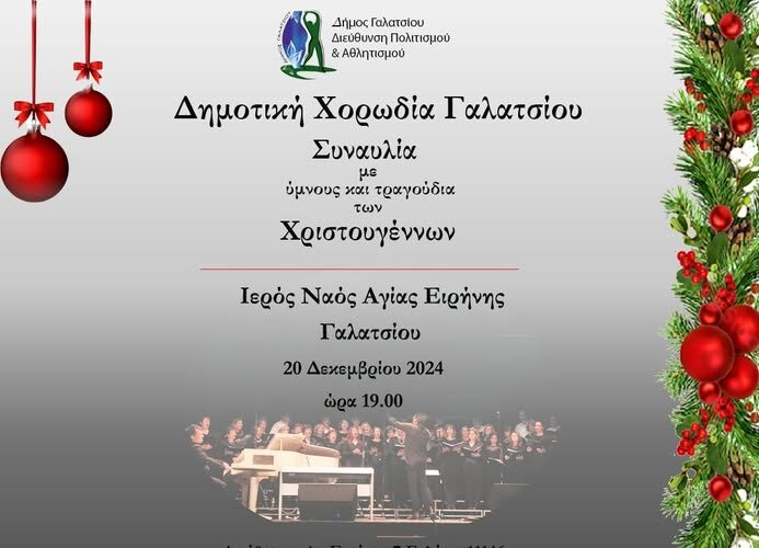 Συναυλία από τη Δημοτική Χορωδία Γαλατσίου με ύμνους και τραγούδια των Χριστουγέννων, στον Ιερό Ναό Αγίας Ειρήνης, την Παρασκευή 20 Δεκεμβρίου 2024, στις 19:00!