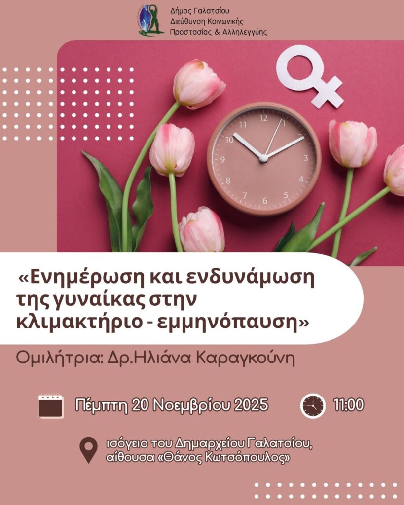 Την Πέμπτη 20 Νοεμβρίου 2025 ομιλία με θέμα : «Ενημέρωση και ενδυνάμωση της γυναίκας στην κλιμακτήριο – εμμηνόπαυση», στις 11:00, στο ισόγειο του Δημαρχείου