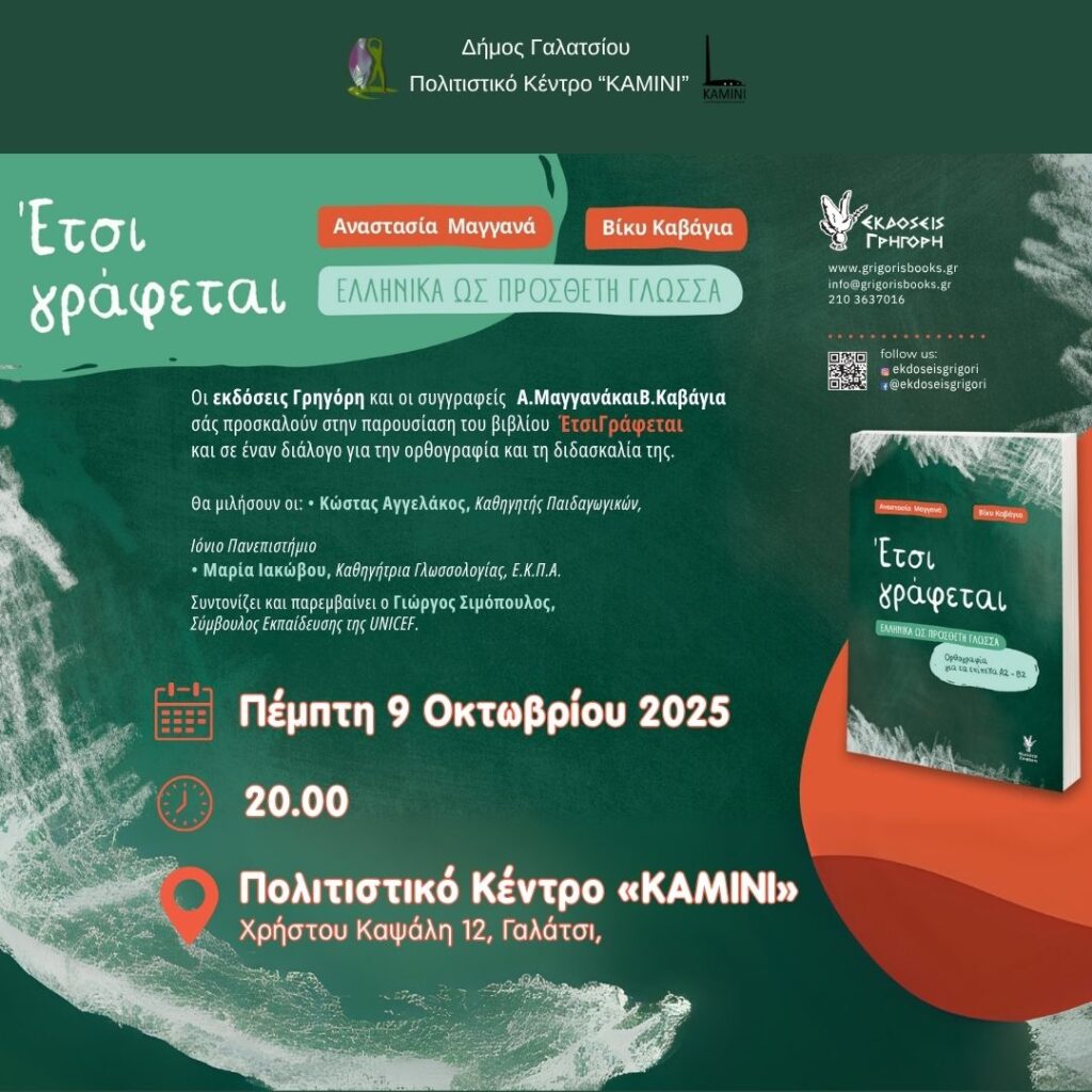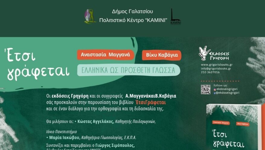 Οι Εκδόσεις Γρηγόρη και οι συγγραφείς Αναστασία Μαγγανά και Βίκυ Καβάγια σας προσκαλούν στην παρουσίαση του βιβλίου «Έτσι γράφεται» και σε έναν διάλογο για την ορθογραφία και τη διδασκαλία της.