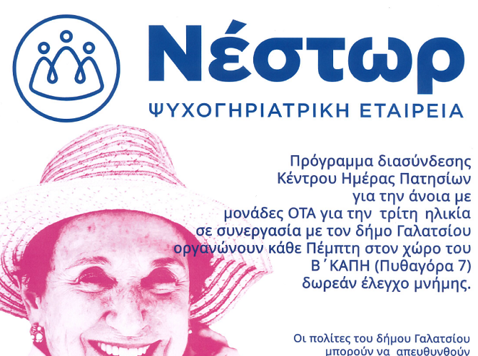 Υπενθυμίζουμε ότι, το Ιατρείο Μνήμης λειτουργεί με επιστημονικό προσωπικό του Κέντρου Ημέρας Πατησίων της ψυχογηριατρικής εταιρείας ΝΕΣΤΩΡ και αφορά πρόγραμμα για την άνοια.