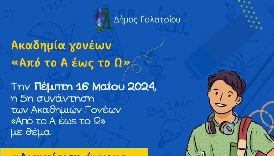 Το Κέντρο Πρόληψης Υγείας (ΚΕΠ Υγείας) του Δήμου Γαλατσίου και το Ελληνικό Διαδημοτικό Δίκτυο Υγιών Πόλεων (ΕΔΔΥΠΠΥ) του Π.Ο.Υ. σας προσκαλεί να παρακολουθήσετε το φετινό κύκλο των Ακαδημιών Γονέων “Από το Α έως το Ω”, το οποίο πραγματοποιείται για 9η συνεχή χρονιά από τη Μονάδα Εφηβικής Υγείας της Β’ Παιδιατρικής Κλινικής του Πανεπιστημίου Αθηνών Νοσοκομείο Παίδων «Π & Α Κυριακού». Στο ανωτέρω πρόγραμμα, παρουσιάζονται θέματα σχετικά με την υγεία, την ανάπτυξη και τη συμπεριφορά των παιδιών, τις σχέσεις στην οικογένεια και το σχολείο κ.λπ. και τελεί υπό την Αιγίδα του ΕΔΔΥΠΠΥ.