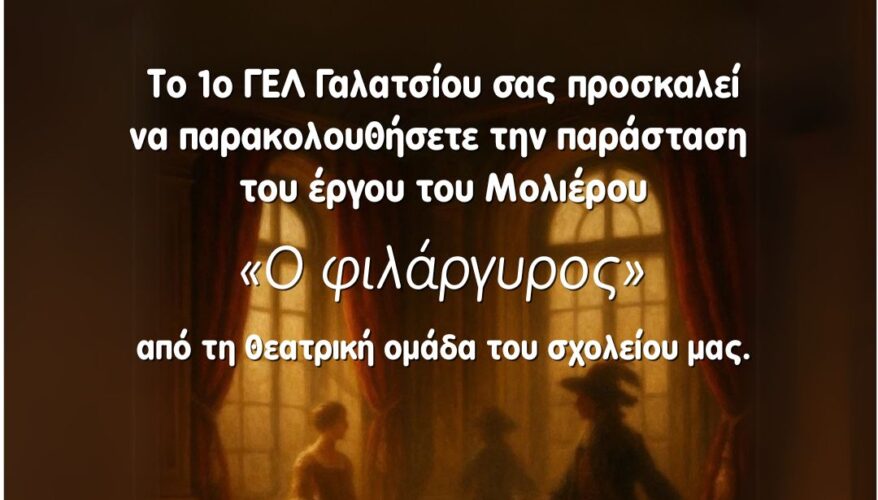 Το 1ο ΓΕΛ Γαλατσίου σας προσκαλεί να παρακολουθήσετε την παράσταση του έργου του Μολιέρου «Ο φιλάργυρος» από τη θεατρική ομάδα του σχολείου.