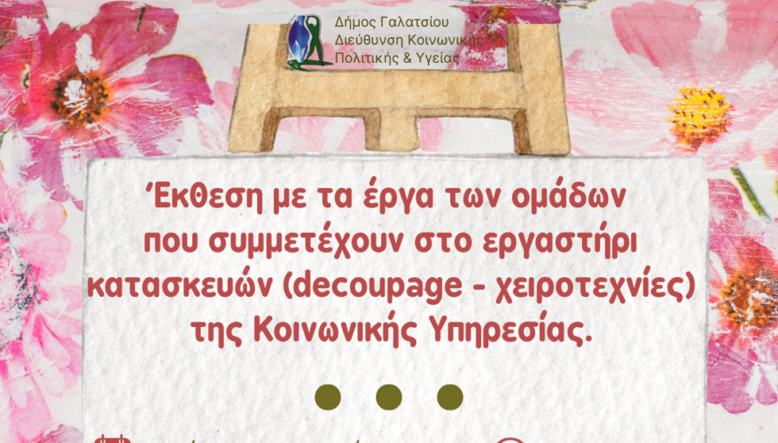 Την Τετάρτη 2 Απριλίου 2025, από τις 12:00 έως τις 15:00, στον πρώτο όροφο του Δημαρχείου, στην αίθουσα 13, θα πραγματοποιηθεί έκθεση με τα έργα των ομάδων που συμμετέχουν στο εργαστήρι κατασκευών (decoupage – χειροτεχνίες) της Κοινωνικής Υπηρεσίας.