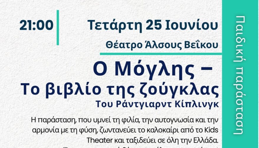 Την Τετάρτη 25 Ιουνίου 2025, στις 21:00, η θεατρική παράσταση «Ο Μόγλης – Το βιβλίο της ζούγκλας» του Ρ. Κίπλινγκ, στο Ανοιχτό Θέατρο Άλσους Βεΐκου, στο πλαίσιο του Θερινού Φεστιβάλ Γαλατσίου 2025.