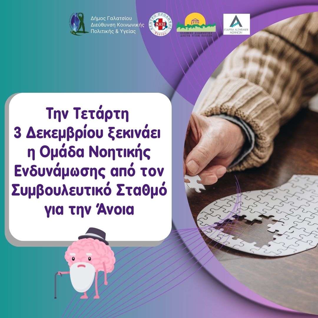 Ο Συμβουλευτικός Σταθμός για την Άνοια της Διεύθυνσης Κοινωνικής Πολιτικής και Υγείας του Δήμου Γαλατσίου, στο πλαίσιο της μη φαρμακευτικής παρέμβασης για την αντιμετώπιση των νοητικών διαταραχών, ξεκινά τη λειτουργία της Ομάδας Νοητικής Ενδυνάμωσης την Τετάρτη 3/12/2025 και κάθε Τετάρτη στις 9:00 π.μ.