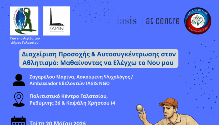 Σημειώνεται ότι τα σεμινάρια Αθλητικής Ψυχολογίας, που υλοποιούνται από το Αθλητικό Σωματείο Εδαφοσφαίρισης Galatsi petanque και την IASIS | At Centro, τέθηκαν υπό την Αιγίδα του Δήμου Γαλατσίου, με στόχο τη διαμόρφωση αθλητικής κουλτούρας και την ενίσχυση της συμπερίληψης στην αθλητική δραστηριότητα!