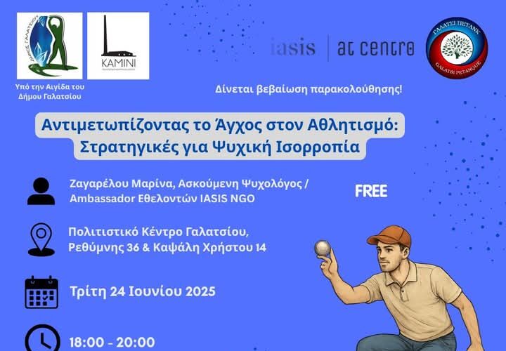 Σημειώνεται ότι τα σεμινάρια Αθλητικής Ψυχολογίας, που υλοποιούνται από το Αθλητικό Σωματείο Εδαφοσφαίρισης Galatsi petanque και την IASIS | At Centro, τέθηκαν υπό την Αιγίδα του Δήμου Γαλατσίου, με στόχο τη διαμόρφωση αθλητικής κουλτούρας και την ενίσχυση της συμπερίληψης στην αθλητική δραστηριότητα!