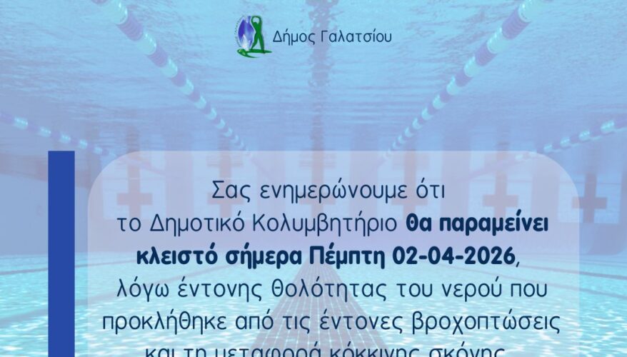 Σας ενημερώνουμε ότι το Δημοτικό Κολυμβητήριο θα παραμείνει κλειστό σήμερα Πέμπτη 02-04-2026, λόγω έντονης θολότητας του νερού που προκλήθηκε από τις έντονες βροχοπτώσεις και τη μεταφορά κόκκινης σκόνης.