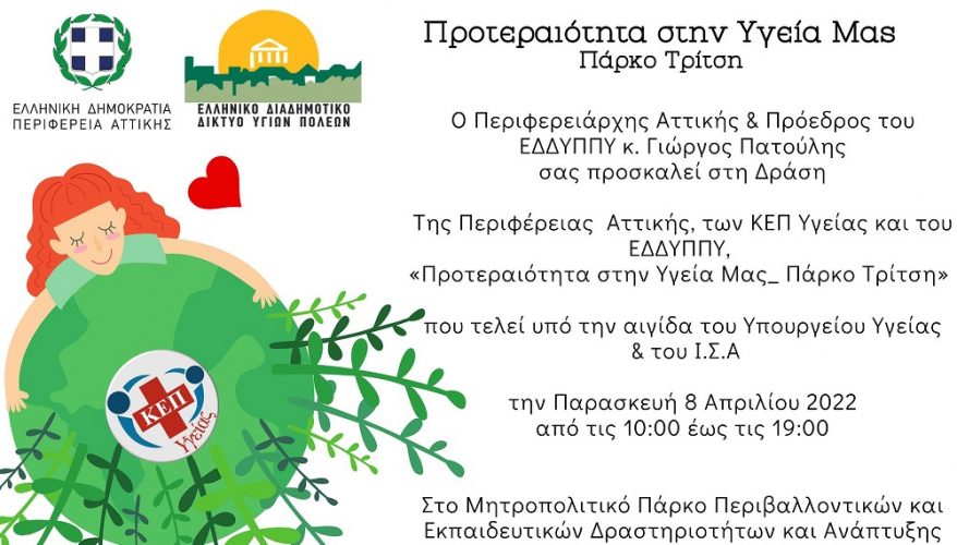 Η δράση τελεί υπό την Αιγίδα του Ι.Σ.Α. και του Υπουργείου Υγείας και θα πραγματοποιηθεί στο Μητροπολιτικό Πάρκο Περιβαλλοντικών και Εκπαιδευτικών Δραστηριοτήτων και Ανάπτυξης Κοινωνικής Οικονομίας “Αντώνης Τρίτσης” με θέμα: «Προτεραιότητα στην Υγεία μας _ Πάρκο Τρίτση».