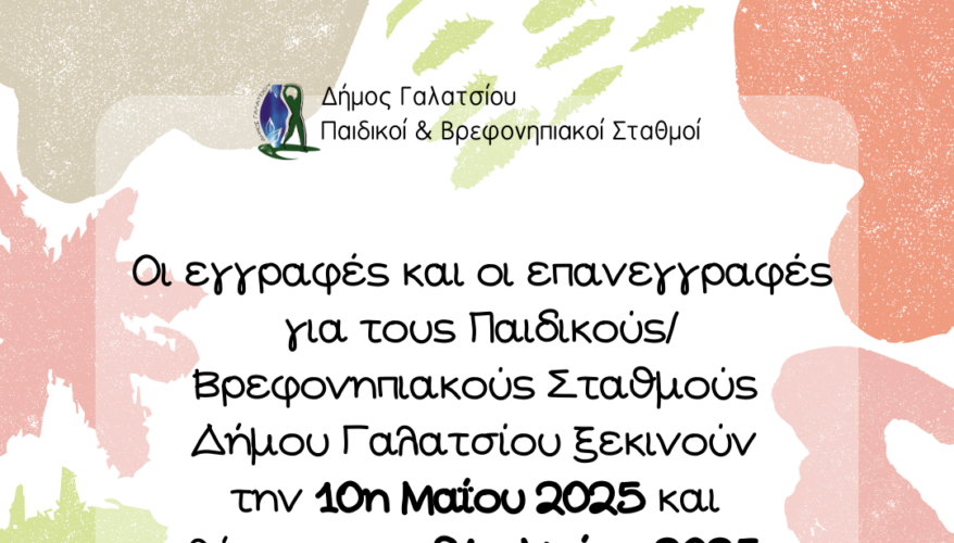 Οι εγγραφές και οι επανεγγραφές για τους Παιδικούς/Βρεφονηπιακούς Σταθμούς Δήμου Γαλατσίου ξεκινούν την 10η Μαΐου 2025 και λήγουν την 31η Μαΐου 2025.
