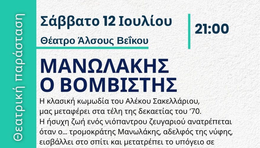 Το Σάββατο 12 Ιουλίου 2025, στις 21::00, η κωμωδία «Μανωλάκης ο βομβιστής», στο Ανοιχτό Θέατρο Άλσους Βεΐκου, στο πλαίσιο του Θερινού Φεστιβάλ Γαλατσίου 2025.