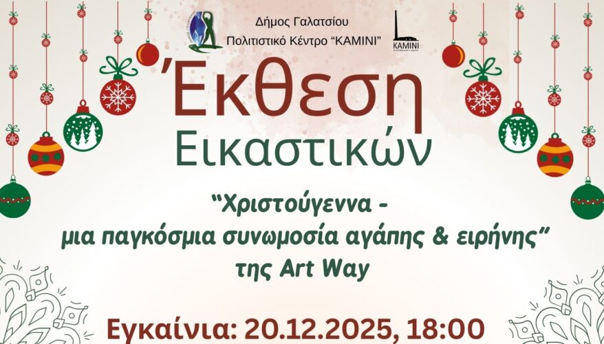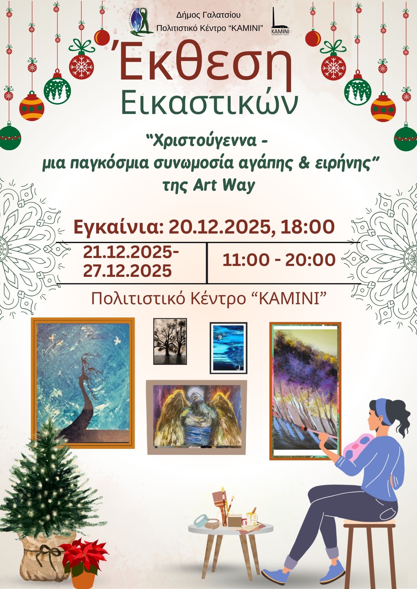 Σας περιμένουμε στα εγκαίνια της έκθεσης με θέμα «ΧΡΙΣΤΟΥΓΕΝΝΑ-ΜΙΑ ΠΑΓΚΟΣΜΙΑ ΣΥΝΩΜΟΣΙΑ ΑΓΑΠΗΣ ΚΑΙ ΕΙΡΗΝΗΣ» το Σάββατο 20 Δεκεμβρίου 2025 και ώρα 18:00, τα οποία θα πραγματοποιηθούν στο Πολιτιστικό Κέντρο Δήμου Γαλατσίου ΚΑΜΙΝΙ (Ρεθύμνης 36 και Χρήστου Καψάλη 14-16, Γαλάτσι Τ.Κ.111 46)