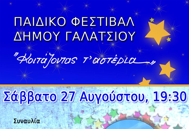 Το Σάββατο 27 Αυγούστου θα διασκεδάσουμε τους μικρούς μας φίλους με τη συναυλία «Xana Zoo» και την Κυριακή 28 Αυγούστου θα απολαύσουμε το ταχυδακτυλουργικό show «Τατουάζ με glitter», στο ανοιχτό Γήπεδο Μπάσκετ Άλσους Βεΐκου (είσοδος Β’) στις 19:30, στο πλαίσιο του Παιδικού Φεστιβάλ Γαλατσίου 2022 «Κοιτάζοντας τ’ αστέρια».