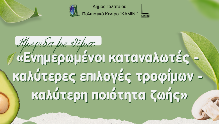 Ημερίδα με θέμα: «ΕΝΗΜΕΡΩΜΕΝΟΙ ΚΑΤΑΝΑΛΩΤΕΣ – ΚΑΛΥΤΕΡΕΣ ΕΠΙΛΟΓΕΣ ΤΡΟΦΙΜΩΝ-ΚΑΛΥΤΕΡΗ ΠΟΙΟΤΗΤΑ ΖΩΗΣ», θα πραγματοποιηθεί το Σάββατο 5 Απριλίου 2025, 10:00 – 14:00, στο Πολιτιστικό Κέντρο Γαλατσίου «Καμίνι» (Χρ.Καψάλη 14-16, Γαλάτσι).