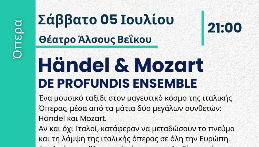Το Σάββατο 5 Ιουλίου 2025, στις 21:00, ένα μουσικό ταξίδι στον μαγευτικό κόσμο της ιταλικής όπερας «Handel & Mozart de profundis ensemble», στο Ανοιχτό Θέατρο Άλσους Βεΐκου, στο πλαίσιο του Θερινού Φεστιβάλ Γαλατσίου 2025.