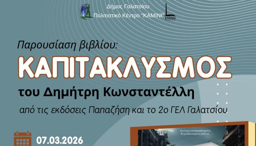 Το Σάββατο 7 Μαρτίου 2026, στις 18:00, η παρουσίαση του βιβλίου «ΚΑΠΙΤΑΚΛΥΣΜΟΣ» του Δημήτρη Κωνσταντέλλη, στο Πολιτιστικό Κέντρο «ΚΑΜΙΝΙ»