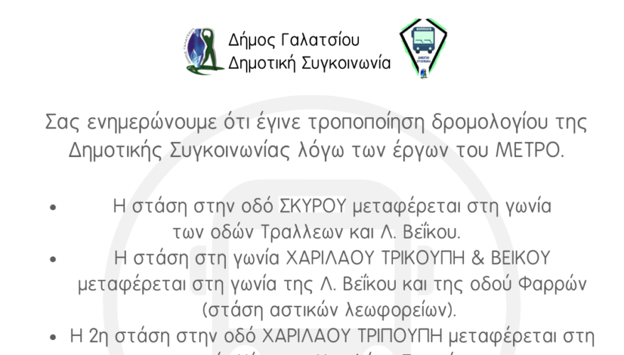 Σας ενημερώνουμε ότι έγινε τροποποίηση δρομολογίου της Δημοτικής Συγκοινωνίας Γαλατσίου λόγω των έργων του ΜΕΤΡΟ.