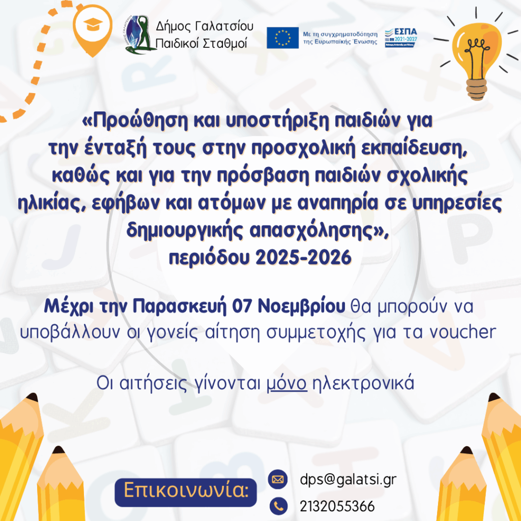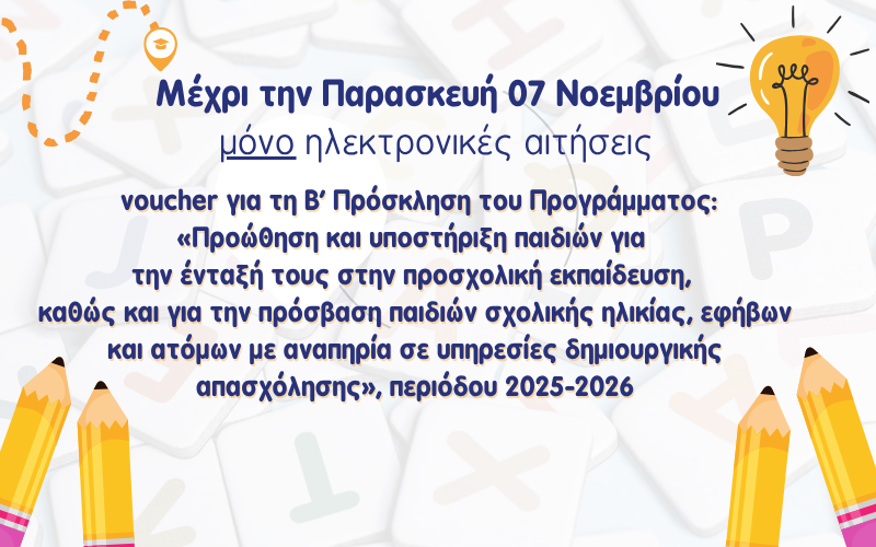 Από την Πέμπτη 30 Οκτωβρίου έως και την Παρασκευή 7 Νοεμβρίου 2025, θα πραγματοποιείται ηλεκτρονικά η υποβολή αιτήσεων για συμμετοχή στη Β’ Πρόσκληση του Προγράμματος της Δράσης «Προώθηση και υποστήριξη παιδιών για την ένταξή τους στην προσχολική εκπαίδευση, καθώς και για την πρόσβαση παιδιών σχολικής ηλικίας, εφήβων και ατόμων με αναπηρία σε υπηρεσίες δημιουργικής απασχόλησης», περιόδου 2025-2026.
