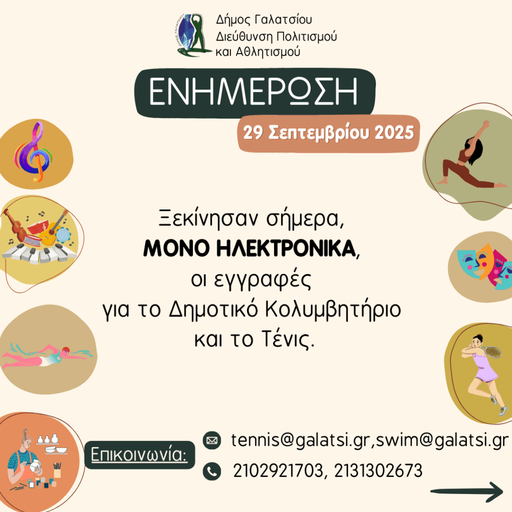 Ξεκίνησαν σήμερα, Δευτέρα 29 Σεπτεμβρίου 2025, ΜΟΝΟ ΗΛΕΚΤΡΟΝΙΚΑ, οι εγγραφές για το Δημοτικό Κολυμβητήριο και το Τένις