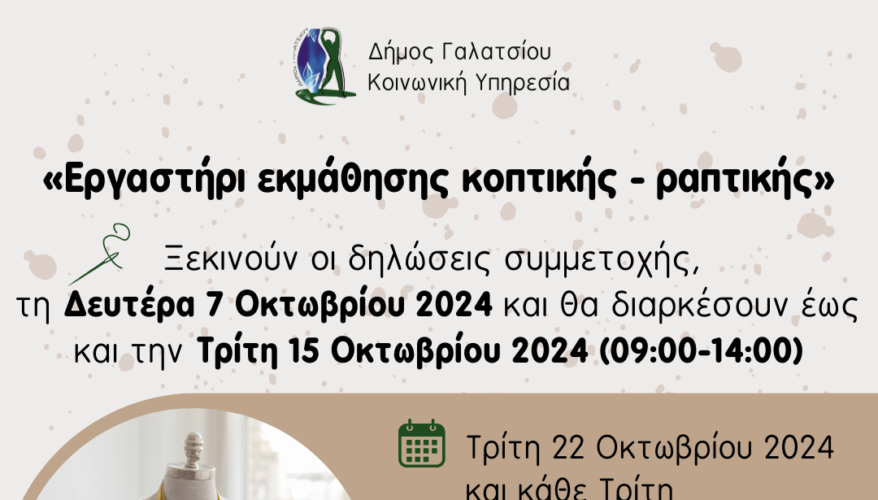 Ξεκινούν οι δηλώσεις συμμετοχής, για το «Εργαστήρι εκμάθησης κοπτικής –ραπτικής», τη Δευτέρα 7 Οκτωβρίου 2024 και θα διαρκέσουν έως και την Τρίτη 15 Οκτωβρίου 2024  (09:00-14:00).