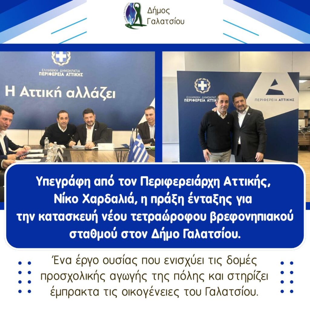 Υπεγράφη από τον Περιφερειάρχη Αττικής, Νίκο Χαρδαλιά, η πράξη ένταξης για την κατασκευή νέου τετραώροφου βρεφονηπιακού σταθμού στον Δήμο Γαλατσίου, συνολικού προϋπολογισμού 2.380.208 ευρώ, στο πλαίσιο του Περιφερειακού Προγράμματος «Αττική 2021–2027».