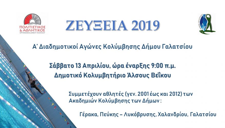 Ο Πολιτιστικός και Αθλητικός Οργανισμός του Δήμου Γαλατσίου «Βασίλης Παπαδιονυσίου» διοργανώνει τους 1ους Διαδημοτικούς Αγώνες Κολύμβησης «ΖΕΥΞΕΙΑ 2019» το Σάββατο 13 Απριλίου 2019, στις 9π.μ., στο Δημοτικό Κολυμβητήριο Γαλατσίου στο Άλσος Βεϊκου, για παιδιά ( γενν. 2001 έως και 2012) που συμμετέχουν στο πρόγραμμα ακαδημιών κολύμβησης.